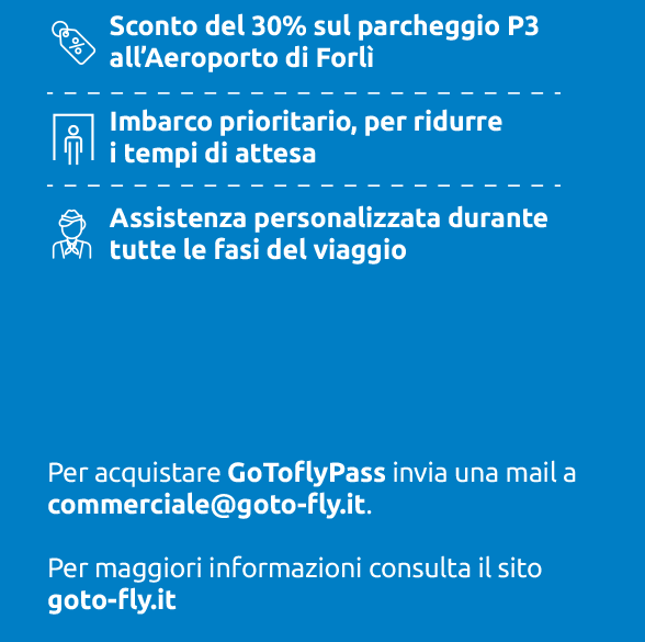 Dedicato a viaggiatori individuali, coppie o famiglie che desiderano la massima flessibilità nella programmazione dei viaggi al giusto prezzo, GoToflyPass Privati è disponibile in tagli da 5, 10 o 20 voli e include una serie di vantaggi tra cui: